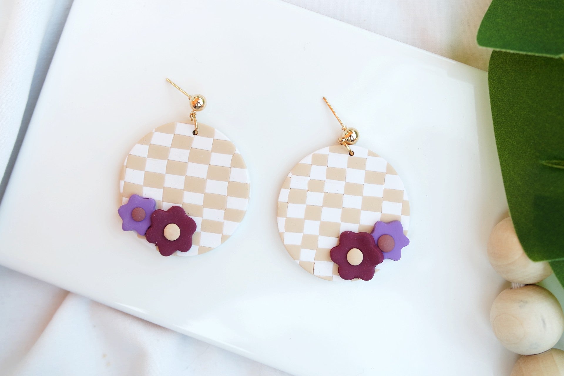 Cream and tan polymer clay dangle, worked into a checkboard pattern. With small flower detail.